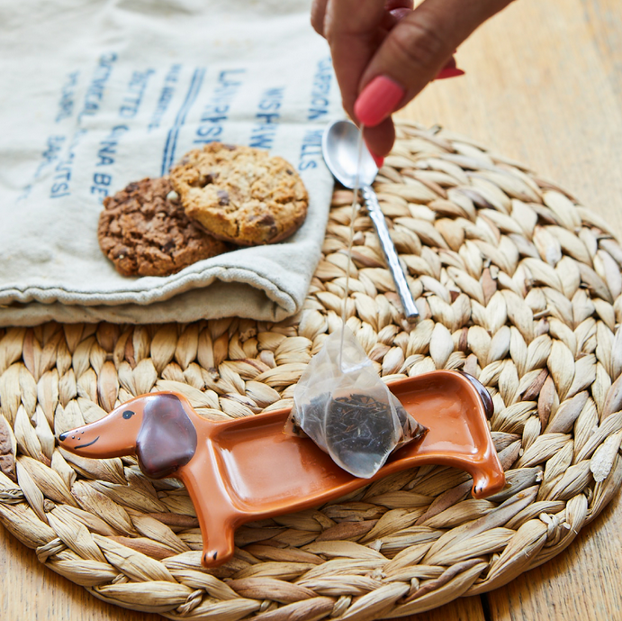 Coupelle en porcelaine en forme Teckel sur laquelle vous pourrez poser un sachet de thé mais aussi des bijoux par exemple.
