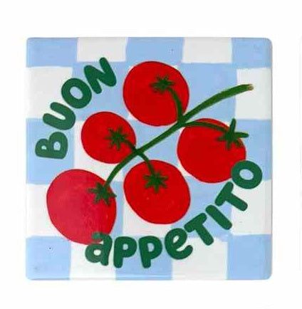 Le petit dessous de verre inspiré par l'Italie avec son petit message "Buon appetito" et sa grappe de tomates